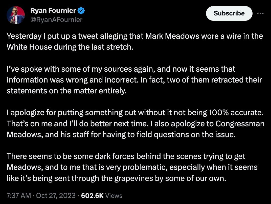 Unpacking Ryan Fournier's Retraction of his Reporting on Trump's Former Chief of Staff Mark Meadows based on Anonymous Sourcing.